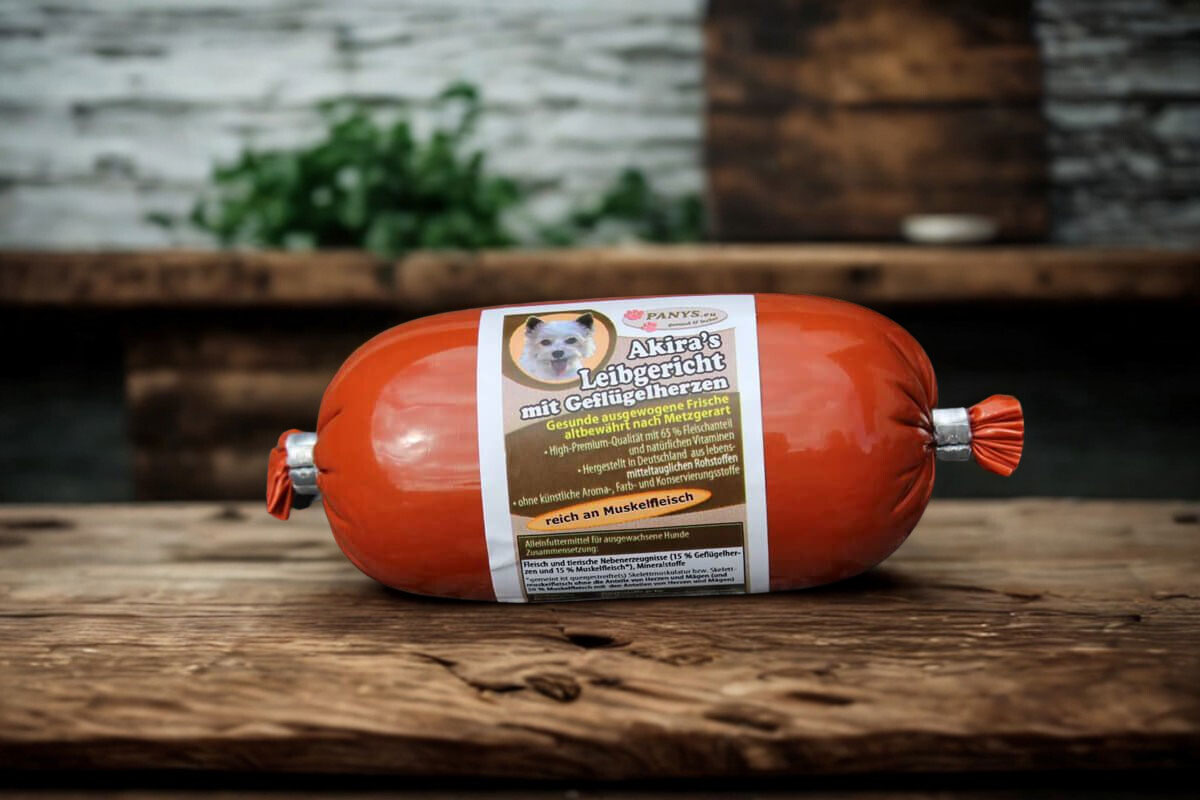 | mit Rind und Geflügelherzen. Hergestellt in Deutschland nach Lebensmittelstandard, natürlich ohne künstliche Aroma- und Farbstoffe und nach glutenfreier Rezeptur. Daher eignet sich Akiras Leibgericht ganz besonders für Hunde die Probleme mit Gluten haben. Die Wurst ist für alle ausgewachsenen Hunde als Alleinnahrung geeignet. Auch Welpen im Alter ab 3 Monaten dürfen schon die PANYS Würste auf 4-5 Mahlzeiten verteilt fressen. Da Welpen allerdings noch mehr Kohlenhydrate benötigen, sollten Sie ihrem Liebling zusätzlich Welpen-Trockenfutter geben. |